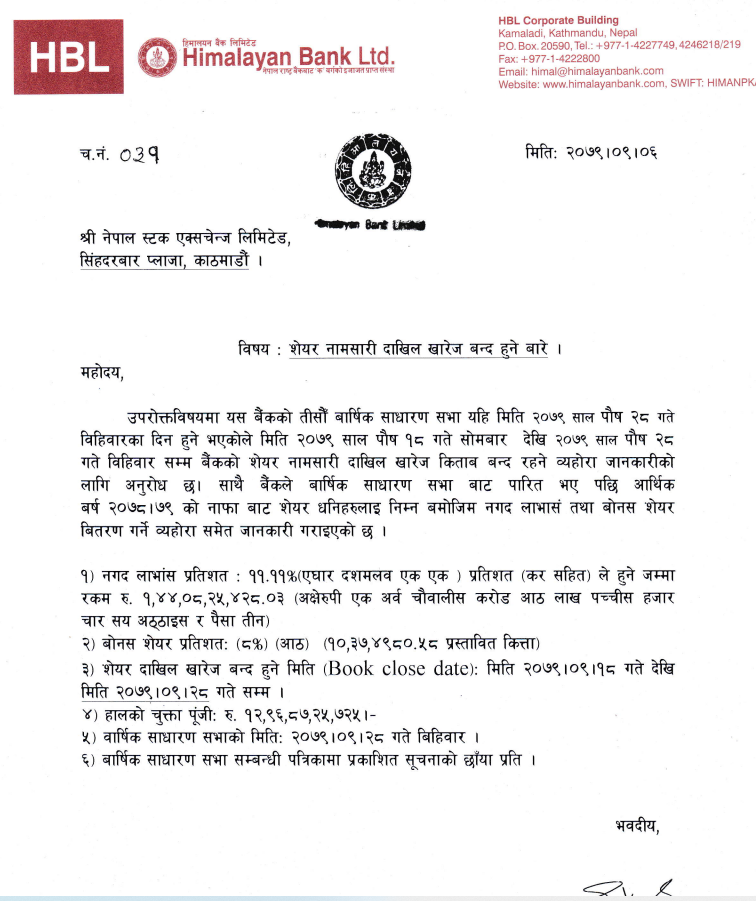 २८ गते बोलाएको सभाका लागि कम्पनीले पुस १८ देखि २८ गतेसम्म बुक क्लोज गर्ने भएको छ । कम्पनीले सभामा ११.११ प्रतिशत नगद लाभांश र ८ प्रतिशत बोनस सेयर दिने प्रस्ताव पेश गर्नेछ । उक्त प्रस्ताव सभाले पारित गरेपछि सेयरधनीले तोकेको लाभांश पाउनेछन् ।