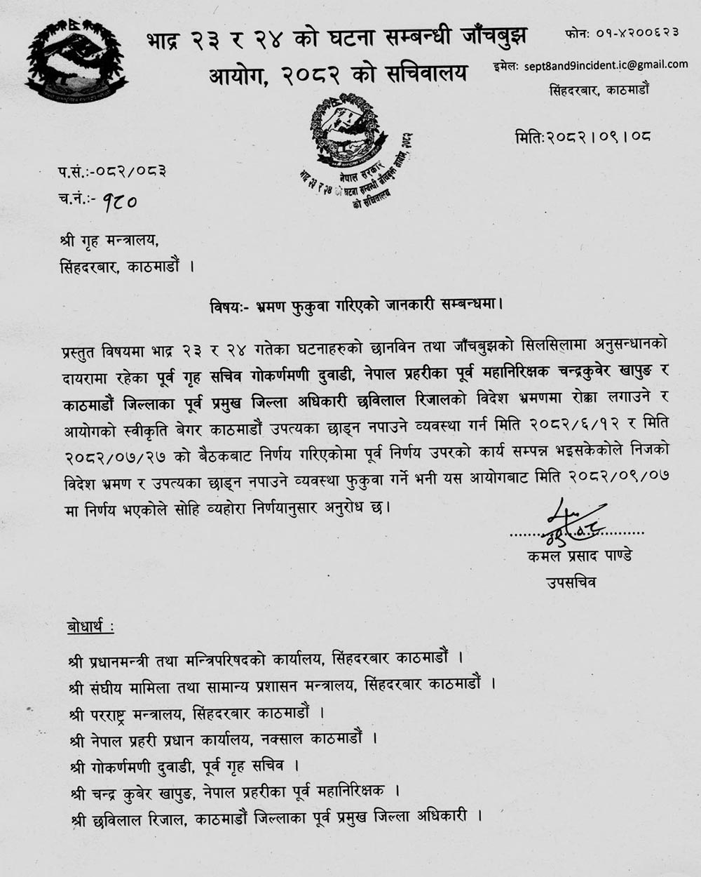 आयोगका उपसचिव कमलप्रसाद पाण्डेले पठाएको उक्त पत्रमा उनीहरूको स्थानहद फुकवा गरिएको र विदेश भ्रमण गर्न समेत पाउने बताइएको छ । उनीहरूको बयान सकिएकाले स्थानहद फुकुवा गरिएको हो ।