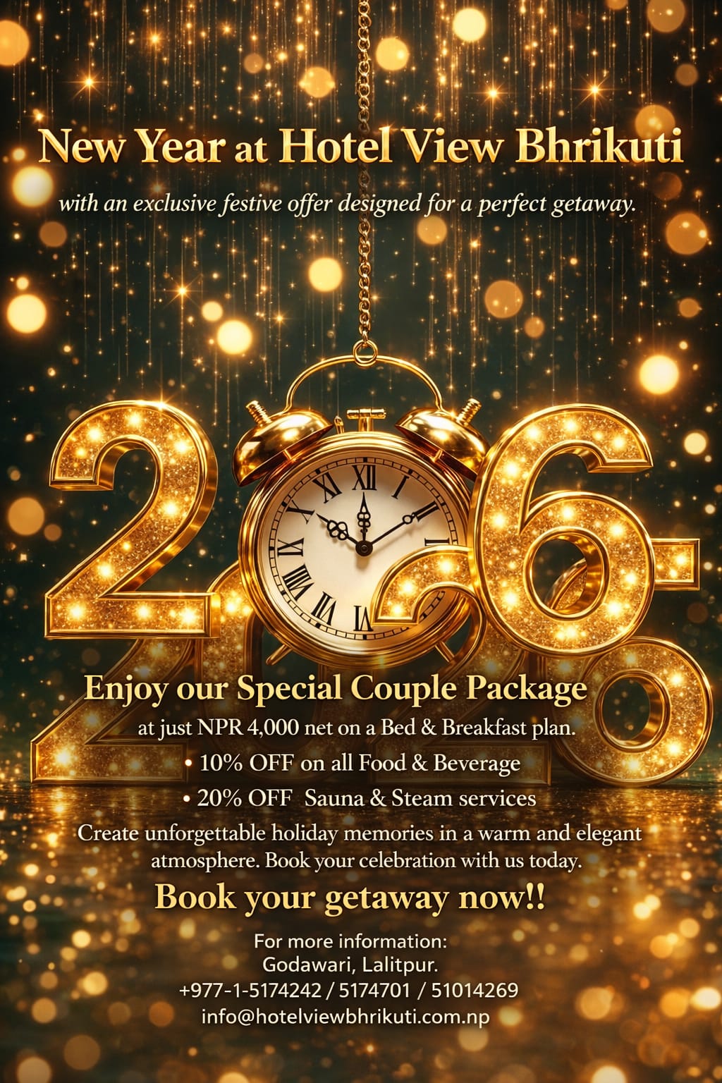 काठमाडौं । होटल भ्यु भृकुटीले क्रिसमस र अङ्ग्रेजी नयाँ वर्ष २०२६ को अवसरमा पाहुनाका लागि विशेष पर्वकालीन अफर सार्वजनिक गरेको छ । उक्त अफर डिसेम्बर २४, २०२५ देखि जनवरी १, २०२६ सम्म लागू हुने होटल व्यवस्थापनले जनाएको छ ।