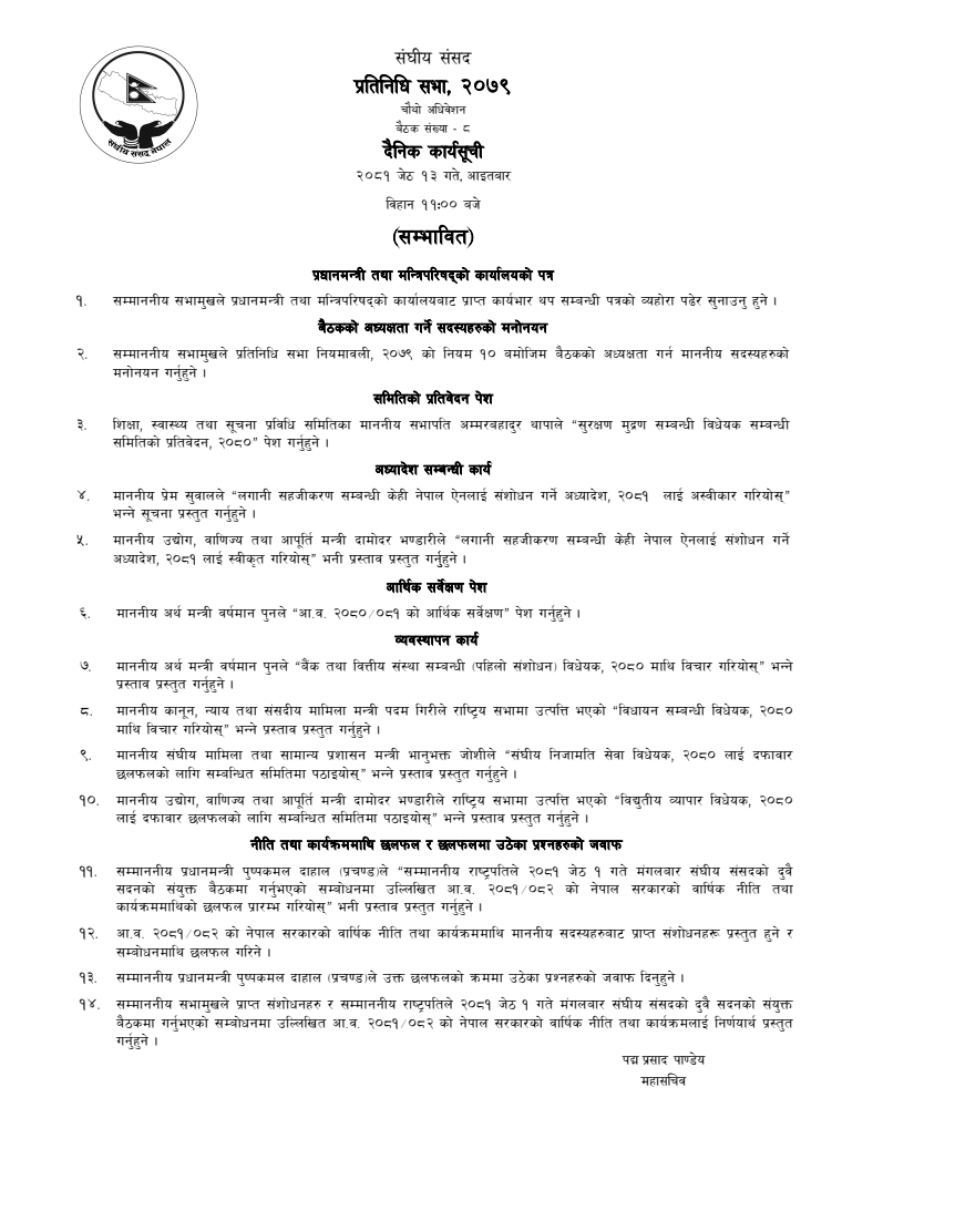 संसद् सचिवालयका अनुसार विभिन्न १४ वटा सम्भावित कार्यसूची राखेको छ । बैठकमा सभामुख देवराज घिमिरेले प्रधानमन्त्री तथा मन्त्रिपरिषद्को कार्यालयबाट प्राप्त कार्यभार थपसम्बन्धी पत्रको ब्यहोरा पढेर सुनाउनेछन् ।