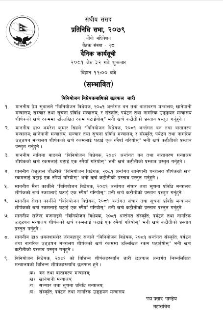 यी मन्त्रालयउपर विभिन्न सांसद्हरुले खर्च घटाउन प्रस्ताव पेस गर्नेछन् । उक्त प्रस्तावहरूलाई पनि आजै निर्णयार्थ प्रस्तुत गरिने छ ।