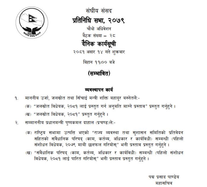 बैठकमा ऊर्जा, जलस्रोत तथा सिंचाईमन्त्री शक्तिबहादुर बस्नेतले ‘जलस्रोत विधेयक, २०८१’ प्रस्तुत गर्ने कार्यसूची रहेको छ ।