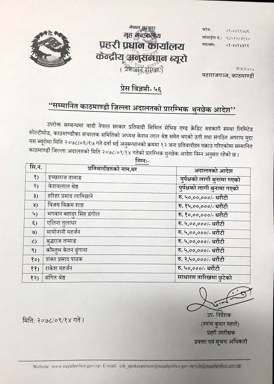 अदालतले सहकारी सञ्चालक समिति अध्यक्ष केशवलाल श्रेष्ठलाई पनि थुनामा पठाउन आदेश दिएको छ । ९ जनालाई धरौटी र एक जनालाई साधारण तारेखमा छाड्न आदेश भएको छ ।