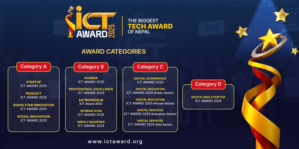 यी अवार्डका विधाहरूसँगै सातै प्रदेशका स्टार्टअपहरूका लागि पनि बुटक्याम्प, प्रदर्शनी र प्रदेशको उत्कृस्ट स्टार्टअपको सम्मानका लागि पनि आवेदन खुला गरिने छ । अवार्डको नोमिनेशनका लागि आधिकारिक वेबसाइट ictaward.org मा लगइन गरी उल्लेखित विवरणहरू समावेश गरेर फारम बुझाउनु पर्नेछ ।