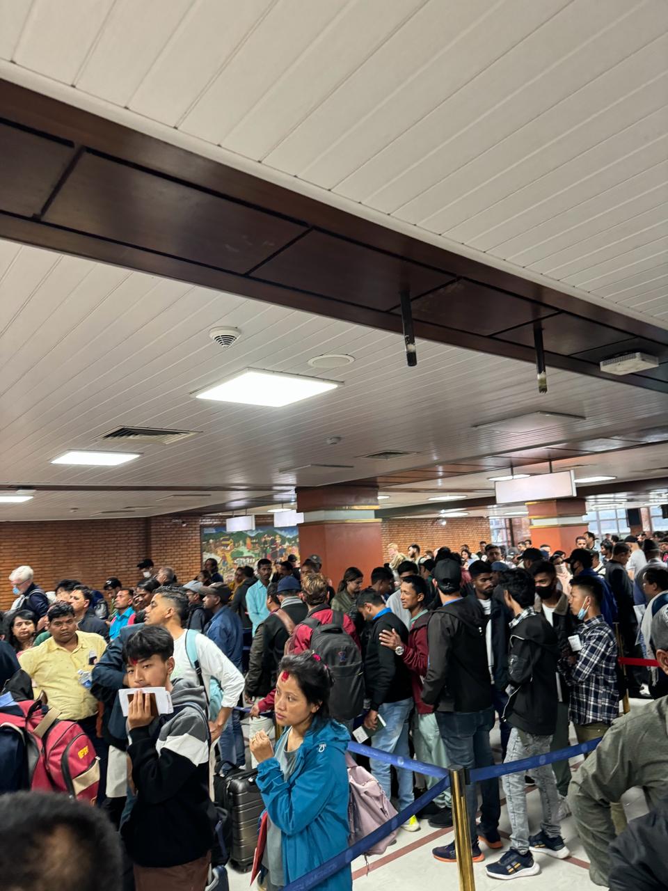 उनले भने, ´मेराे १० बजेकाे फलाईट छ । तर अहिले सम्म जाँच पास भएको छैन । यात्रुले अध्यागमन विभाग भरिएकाे छ । झन्डै १ हजार जना हाेलान् । `