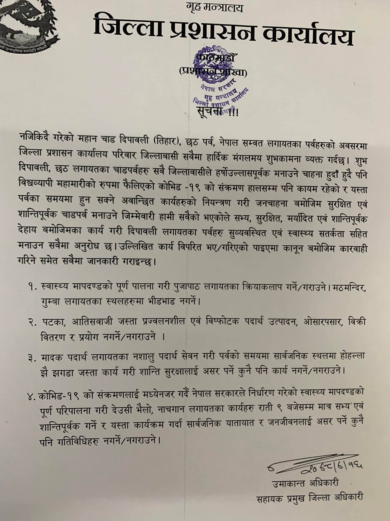 जिल्ला प्रशासन कार्यालय काठमाडौंले आज विज्ञप्ति जारी गर्दै कोभिड–१९ संक्रमण हुन नदिन स्वास्थ्य मापदण्ड पालना गर्दैै देउसी खेल्न पाइने सूचना जारी गरेको हो ।