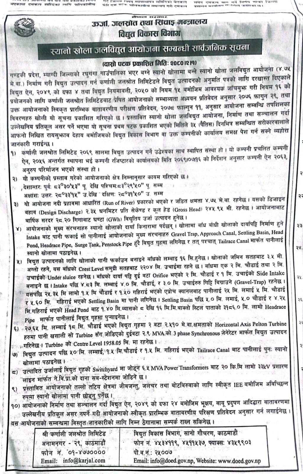 विद्युत विकास विभागले सार्वजनिक सूचना जारी गर्दै सरोकारवाला निकायहरुलाइ ३५ दिनभित्र लिखित रायरसुझाव पेस गर्न आग्रह गरेको छ ।
