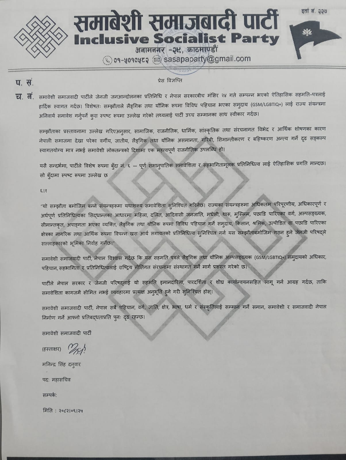 मङ्सिर २४ गते जेनजी जनआन्दोलनका प्रतिनिधि र नेपाल सरकारबीच सम्पन्न भएको ऐतिहासिक सहमति–पत्रलाई समावेशी समाजवादी पार्टीले स्वागत गरेको छ। पार्टीले विशेषत: लैङ्गिक तथा यौनिक रूपमा विविध पहिचान भएका समुदाय (जिएसएम–एलजीबीटीक्यूआई)लाई राज्य संयन्त्रमा अनिवार्य समावेश गर्नुपर्ने कुरा स्पष्ट रूपमा उल्लेख भएको तथ्यलाई उच्च सम्मानका साथ स्वीकार गरेको बताएको छ। महासचिव मनिन्द्र सिंह दनुवारले निकालेको निकालेको विज्ञप्तिमा समाजमा विद्यमान वर्गीय, जातीय, लैङ्गिक तथा यौनिक असमानता, गरिबी, सिमान्तीकरण र बहिष्करण अन्त्य गर्ने सहमतिमा व्यक्त दृढ सङ्कल्प समावेशी लोकतन्त्रको दिशामा महत्त्वपूर्ण राजनीतिक उपलब्धि भएको उल्लेख गरिएको छ ।