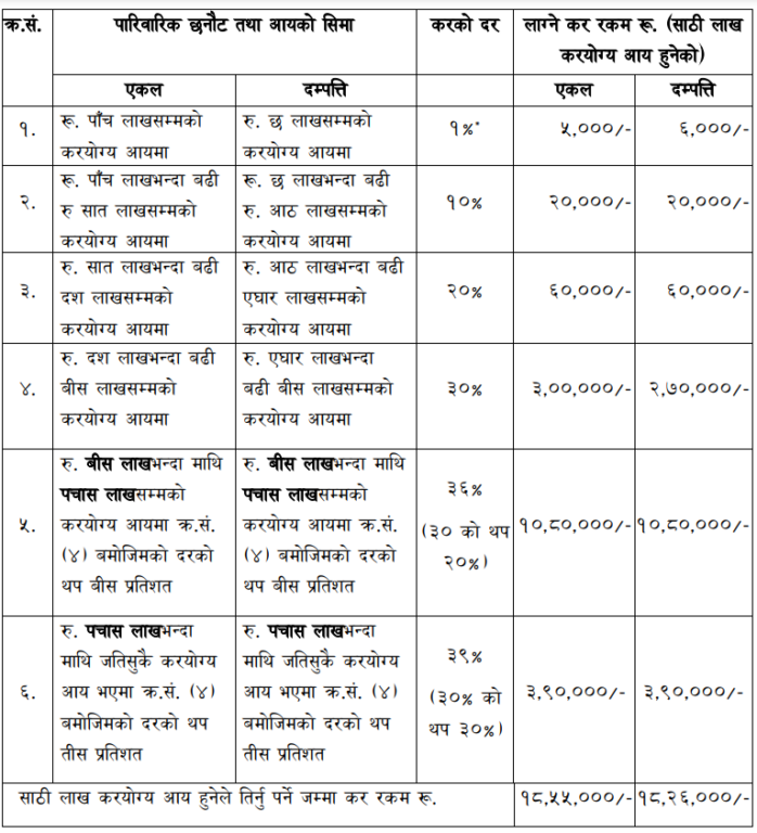 आयको स्ल्याब अनुसार न्यूनतम १ देखि अधिकतम ३९ प्रतिशतसम्म कर तिर्नुपर्ने उल्लेख छ । आन्तरिक राजस्व विभागले प्राकृतिक व्यक्तिको लागि लागु हुने आयकरको शुक्रबार सार्वजनिक गरेको हो ।