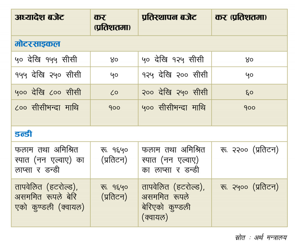 काठमाडौं । भदौ २७, सरकारले फलाम तथा स्टिलबाट बनेका स्पात (नन एल्वाए), लाप्सा डन्डीलगायत वस्तुमा करका दर बढाएको छ । अर्थमन्त्री जनार्दन शर्माले शुक्रबार संसद्मा पेस गरेको अध्यादेशको बजेटलाई प्रतिस्थापन गर्न बनेको विधेयकमार्फत ती वस्तुमा करका दर बढाइएको हो । यससँगै अब फलामका डन्डी तथा छडको मूल्य बढ्ने भएकाले समग्र निर्माण क्षेत्रको लागतमा असर पर्ने जानकारहरू बताउँछन् ।