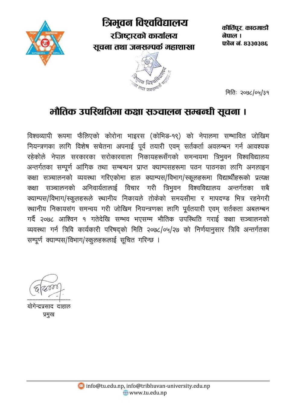 त्रिभुवन विश्व विद्यालयले सम्भवभएसम्म भौतिक उपस्थितिमा नै कक्षा सञ्चालन गर्न आंगिक क्याम्पसहरूलाई निर्देशन दिएको छ ।