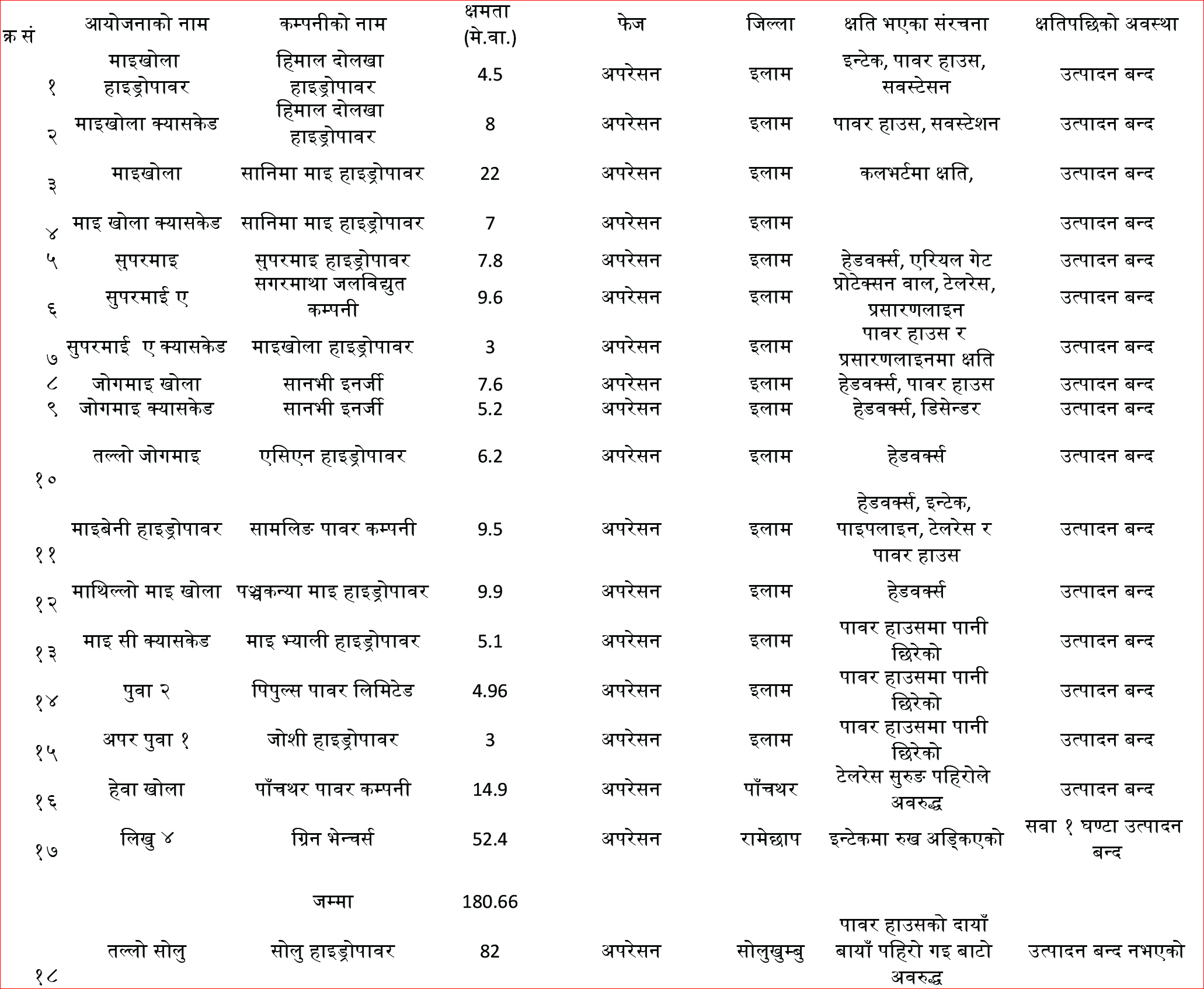 स्वतन्त्र ऊर्जा उत्पादकहरूको सस्था, नेपाल (इप्पान)ले सङ्कलन गरेको सोमबार दिउँसोसम्मको प्रारम्भिक तथ्याङ्क अनुसार सञ्चालनमा रहेका १८० मेगावाट क्षमताका १७ आयोजना र निर्माणाधीन अवस्थामा रहेका ३३८ मेगावाट क्षमताका १५ जलविद्युत् आयोजना बाढीबाट प्रभावित भएका हुन् ।