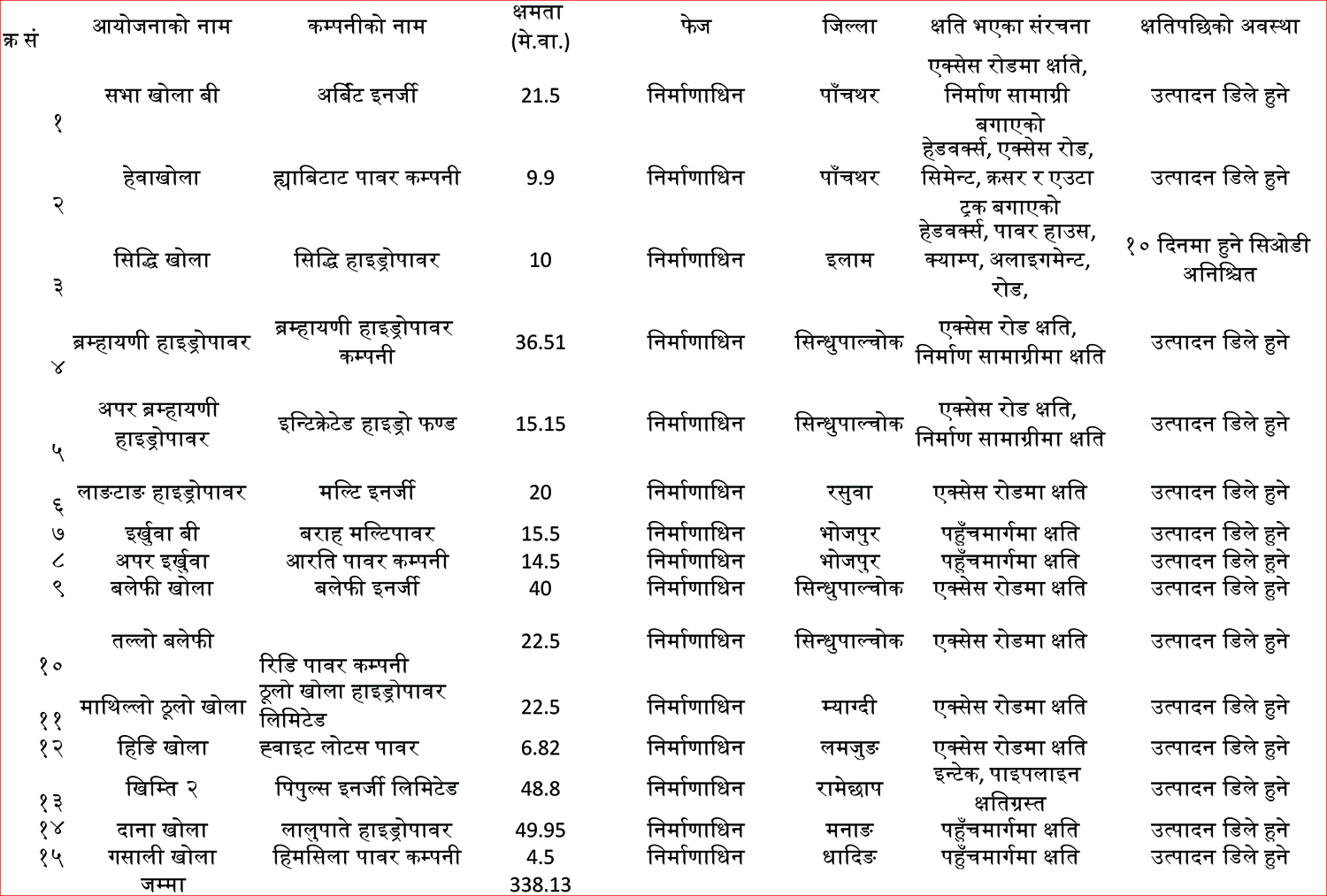 रसुवामा रहेको २० मेगावाटको लाङटाङ खोला, भोजपुरमा रहेको १५.५ मेगावाटको इर्खुवा खोला बी, १४.५ मेगावाटको माथिल्लो इर्खुवा, म्याग्दीमा रहेको २२.५ मेगावाटको माथिल्लो ठूलो खोला, लमजुङमा रहेको ६.८२ मेगावाटको हिडी खोला, रामेछापमा रहेको ४८.८ मेगावाटको खिम्ति २ र धादिङमा रहेको ४.५ मेगावाटको गसाली खोला जलविद्युत् आयोजनाको पहुँचमार्ग लगायतका विभिन्न संरचनामा क्षति पुगेका कारण यी आयोजनाको विद्युत उत्पादन मिति पर सरेको छ ।