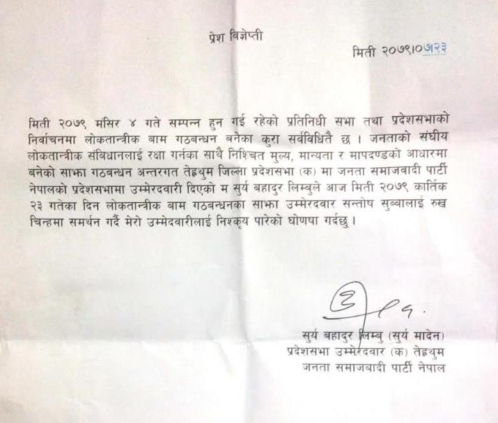 काठमाडौँ । जनता समाजवादी पार्टी नेपालका सूर्यबहादुर लिम्बु (सुर्य मादेन) ले आफ्नो उम्मेदवारी निष्क्रिय गरेका छन् । बुधवार एक विज्ञप्ति जारी गर्दै उनले आफ्नो उम्मेदवारी निष्क्रिय गरेको सार्वजनिक गरेका छन् ।