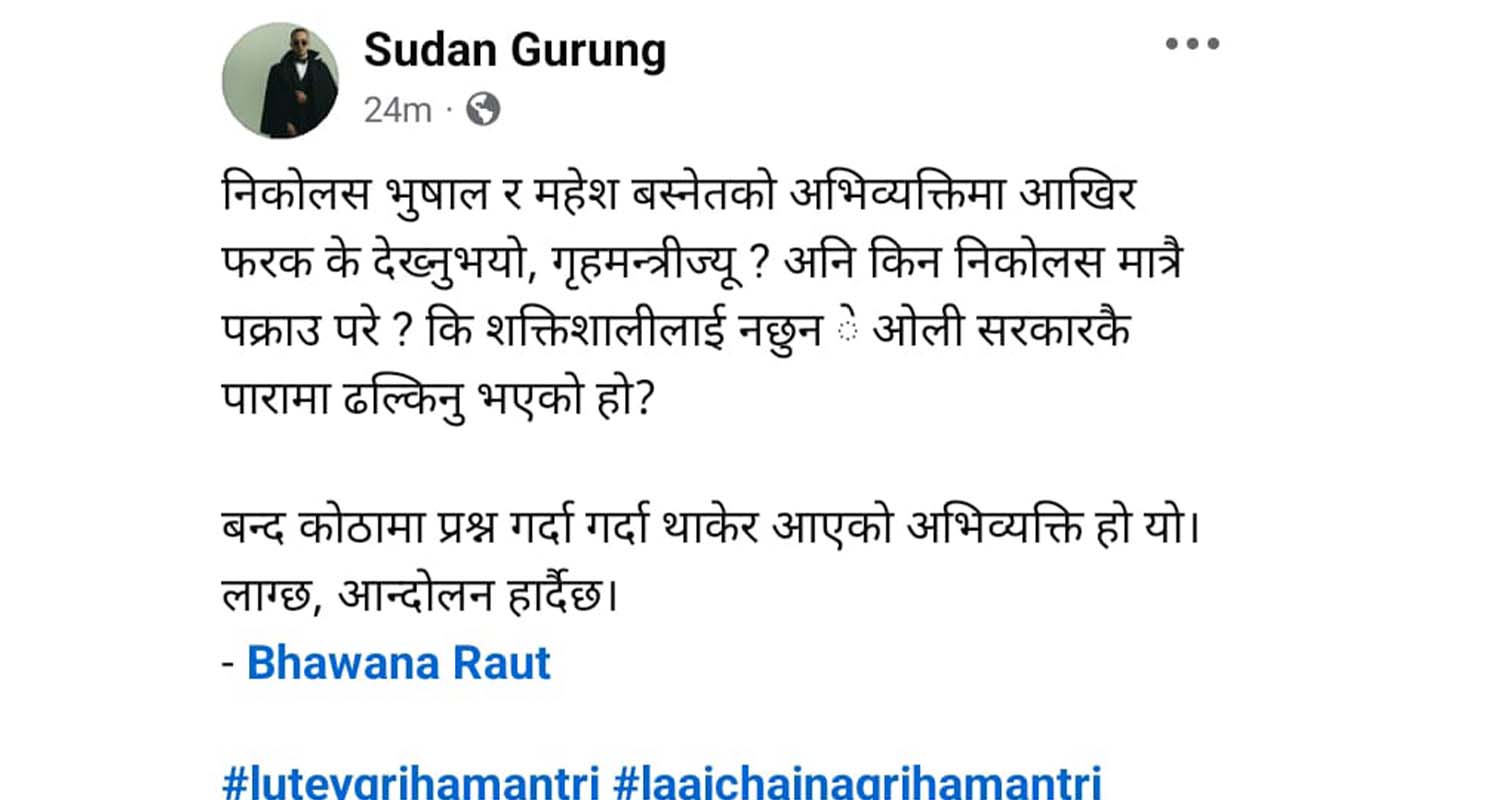 “निकोलस भुसाल र महेश बस्नेतको अभिव्यक्तिमा आखिर फरक के देख्नुभयो गृहमन्त्रीज्यू ? अनि किन निकोलसमात्रै पक्राउ परे ? कि शक्तिशालीलाई नछुने ओली सरकारकै पारामा ढल्किनुभएको हो ? बन्द कोठामा प्रश्न गर्दा गर्दा थाकेर आएको अभिव्यक्ति हो यो । लाग्छ आन्दोलन हार्दैछ ।”