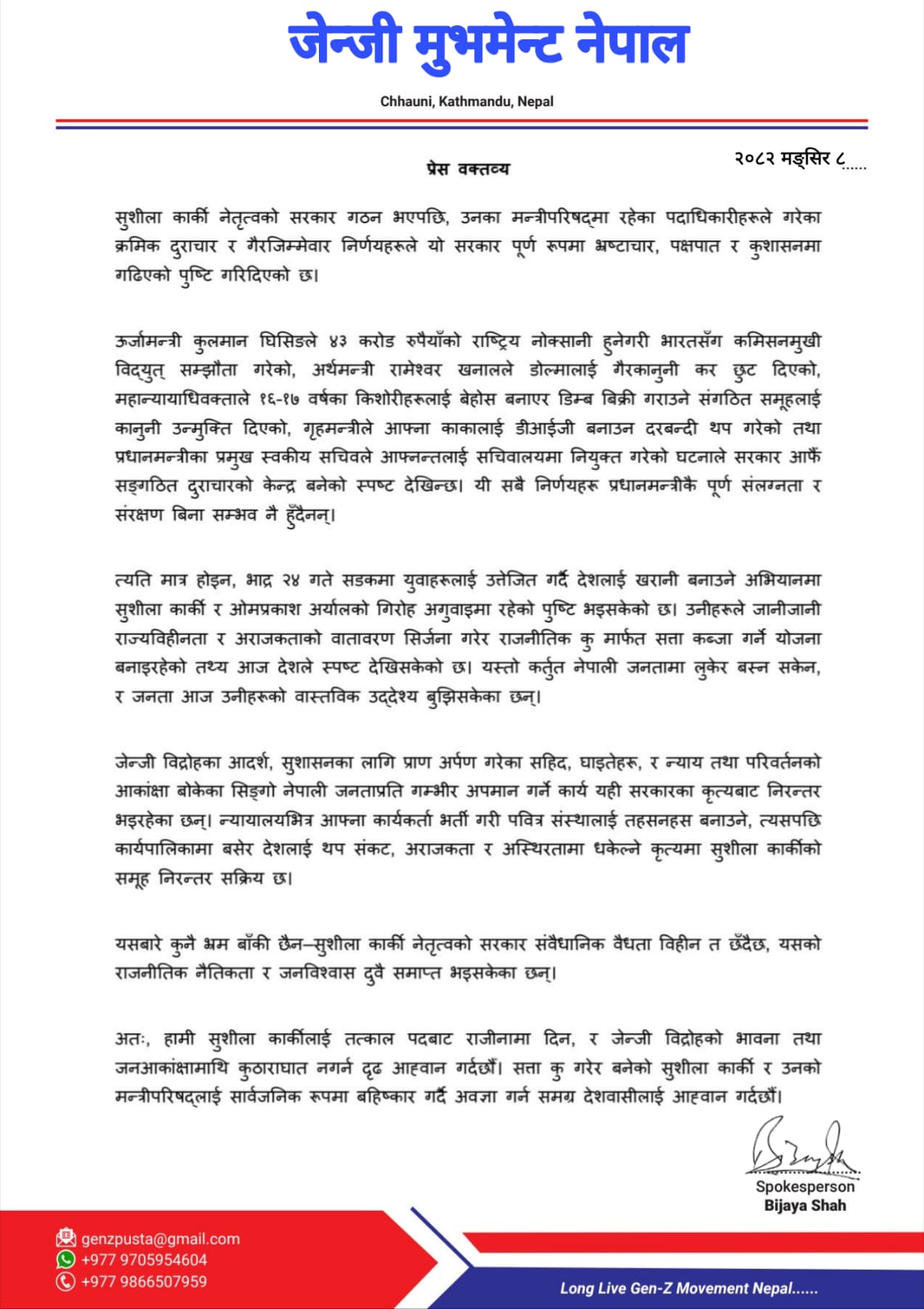 काठमाडौँ । जने जी मुभमेन्ट नेपालले प्रधानमन्त्री सुशीला कार्की नेतृत्वको सरकारले गैरजिम्मेवार निर्णयहरू गर्न थालेको तथा सरकार पूर्ण रूपमा भ्रष्टाचार, पक्षपात र कुशासनमा अघिबढेको भन्दै राजीनामा दिन आग्रह गरेको छ ।