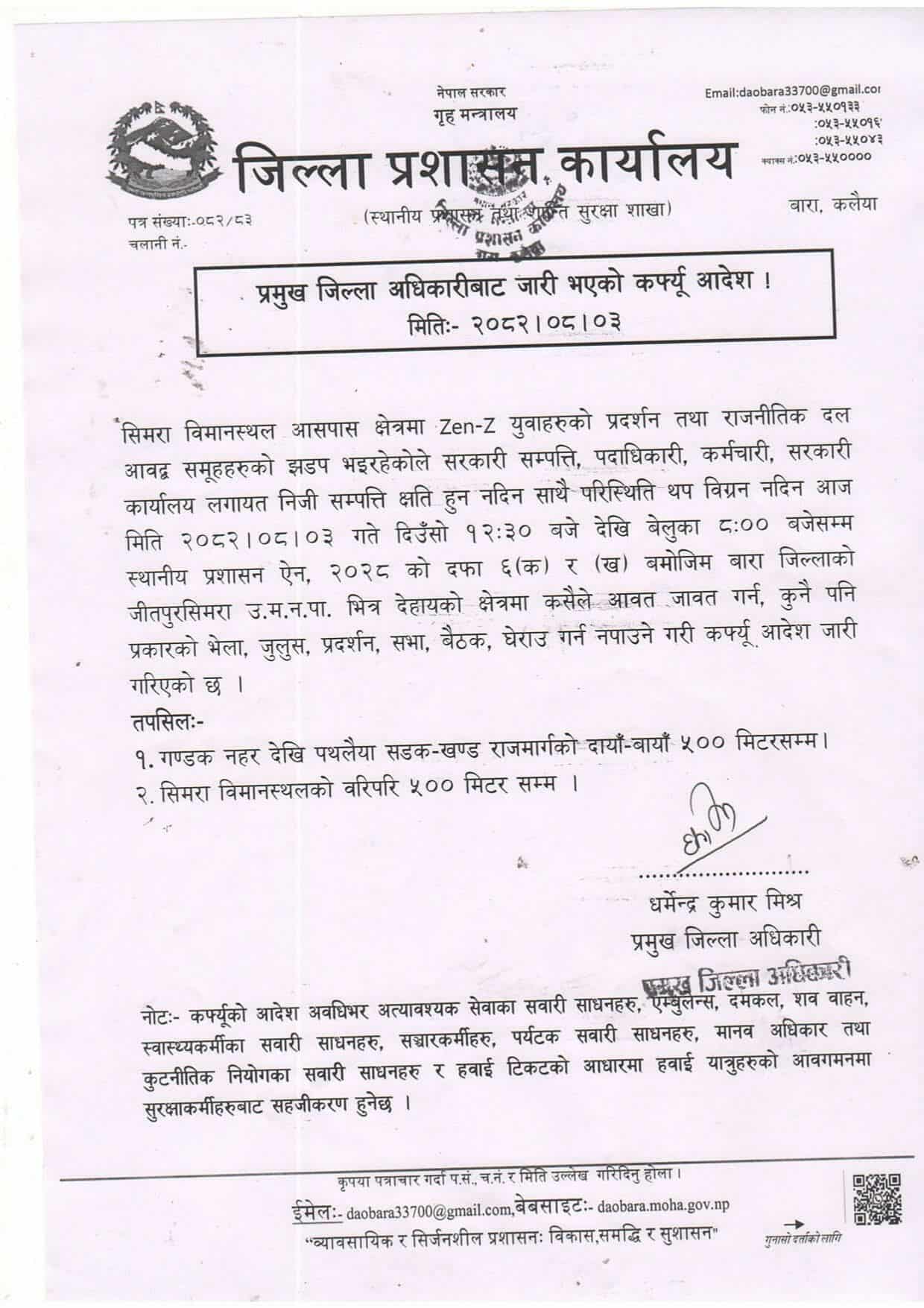 स्थिति तनावग्रस्त बनेपछि बारा प्रशासनले विमानस्थल आसपासको क्षेत्रमा बेलुका ८ बजेसम्म कर्फ्यू आदेश जारी गरेको छ ।