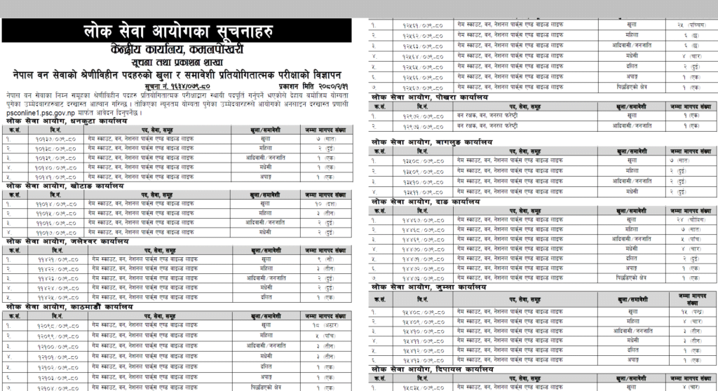 आयोगले वन सेवा अन्तर्गत गेम स्काउट, वन रक्षक तथा माहुत पदका लागि रोजगार खुलाएको सूचनामा उल्लेख गरेको छ । आयोगको धनकुटा कार्यालयबाट ११ जना, खोटाङ कार्यालयबाट १७ जना, काठमाडौं कार्यालयबाट ३२ जना, हेटौंडा कार्यालयबाट ४५ जना, पोखरा कार्यालयबाट २ जना, बागलुङ कार्यालयबाट १३ जना, दाङ कार्यालयबाट ४४ जना, जुम्ला कार्यालयबाट २७ जना, दिपायल कार्यालयबाट ७ जना र महेन्द्रनगर कार्यालयबाट ३१ जनाका लागि रोजगारी खुलाएको हो ।
