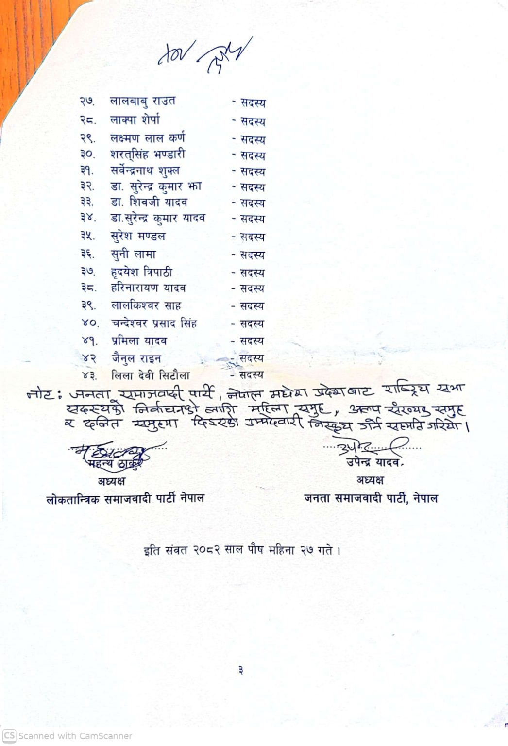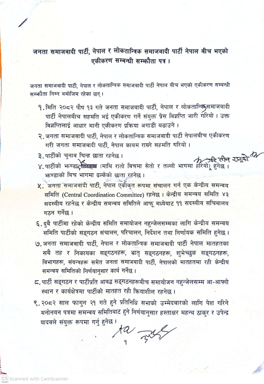 समन्वय समितिले ११ सदस्यीय सचिवालय गठन गर्ने सहमति पत्रमा उल्लेख छ । एकीकृत पार्टीको नाम जनता समाजवादी पार्टी (जसपा) नेपाल रहने सहमति पत्रमा उल्लेख छ ।