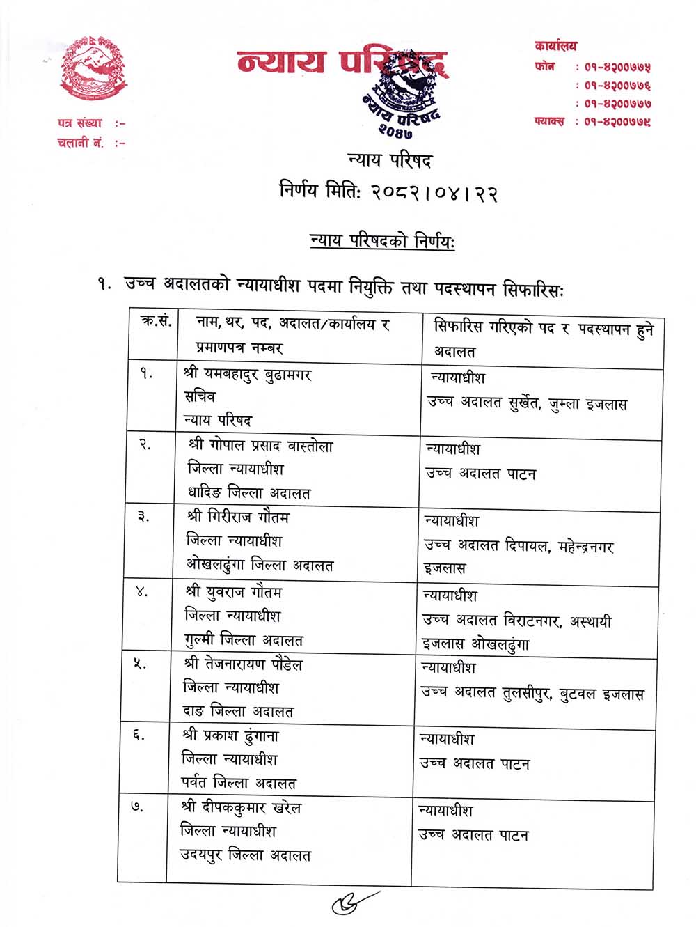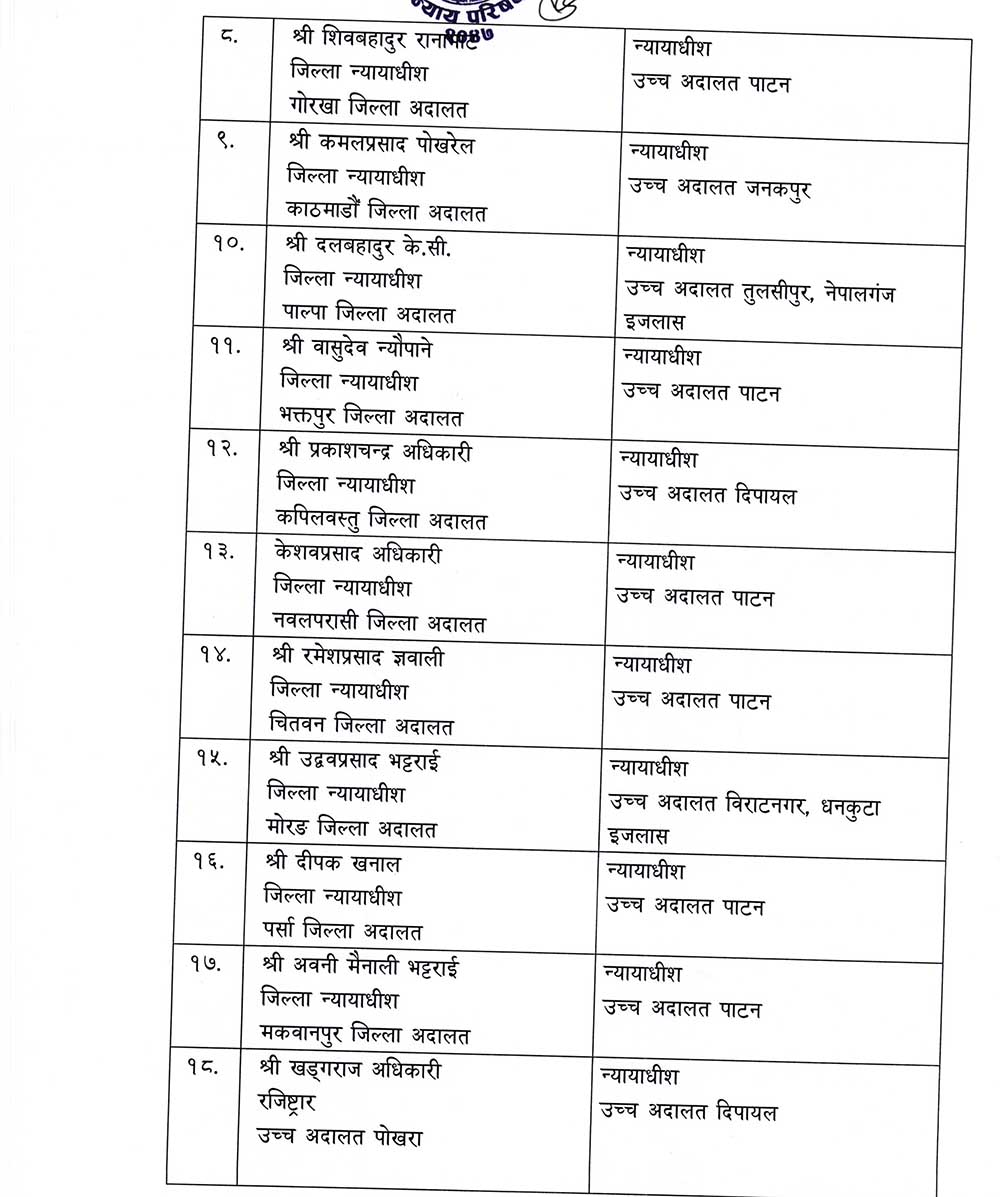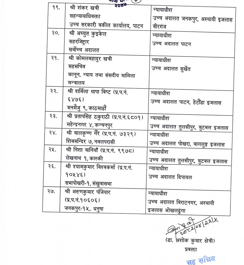 काठमाडौँ । न्याय परिषद्ले उच्च अदालतमा २७ न्यायाधीश नियुक्तिका लागि सिफारिस गरेको छ।