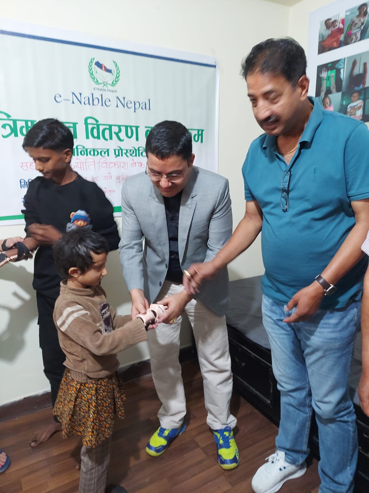 ई–नेबल नेपालको कार्यालयमा आयोजित कार्यक्रममा ज्योति विकास बैंकका प्रमुख कार्यकारी अधिकृत कपिल ढकालले ई–नेबल नेपालका अध्यक्ष सुरेन्द्र श्रेष्ठको उपस्थितिमा उक्त कृत्रिम हातहरु आवश्यकता भएका बालबालिकालाई प्रदान गरिएको हो ।