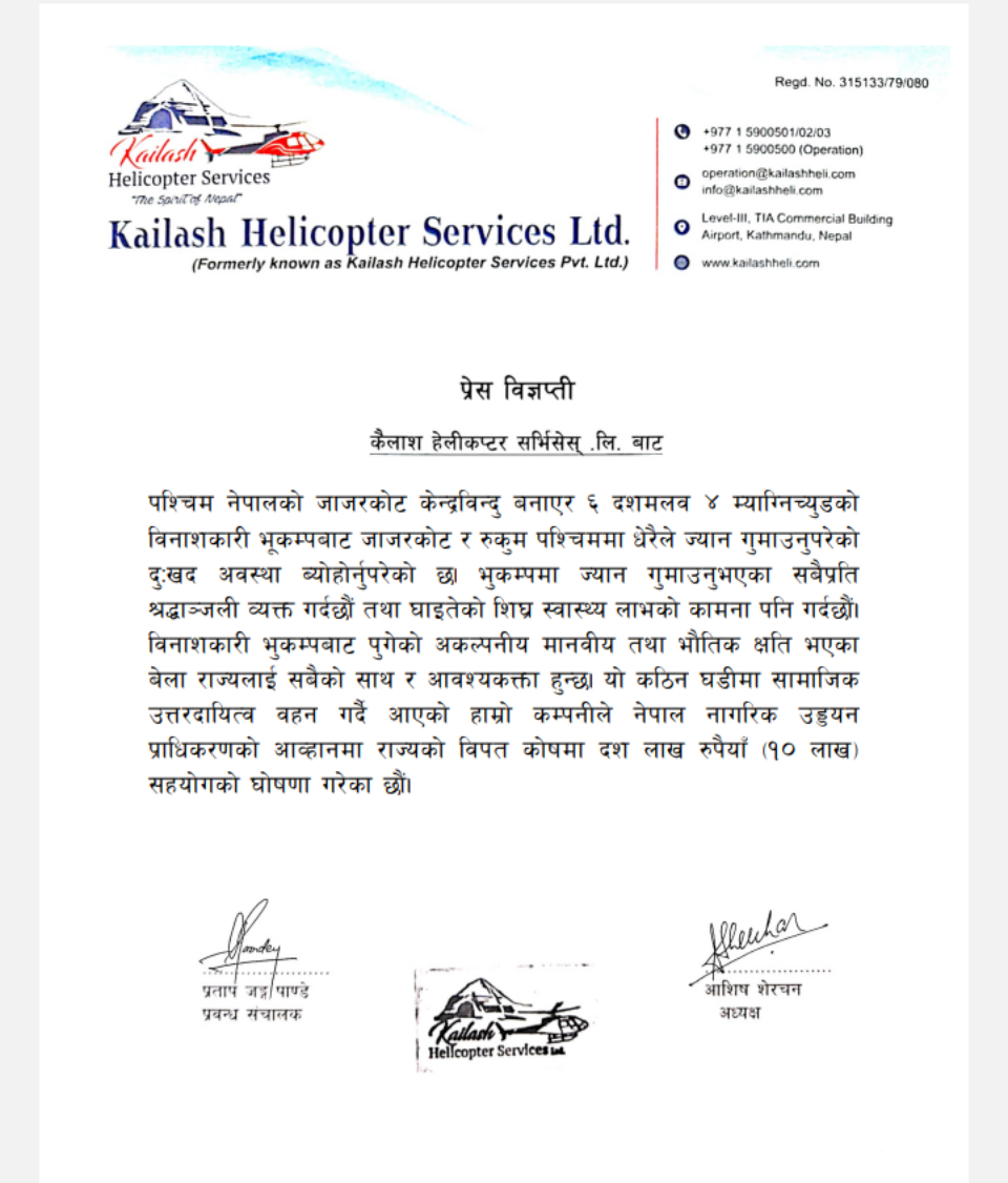 कैलाश हेलिकप्टर सर्भिसेस कम्पनीका अध्यक्ष आशिष् शेरचन र प्रबन्ध संचालक प्रताप जंङ्ग पाण्डेले एक विज्ञप्ति जारी गर्दै भूकम्पपछि भएको धनजनको क्षतिप्रति गहिरो दुःख व्यक्त गरेका छन्। सरकारले सुरु गरेको राहत कोषमा कम्पनीबाट १० लाख रुपैयाँ जम्मा गर्ने विज्ञप्तिमा भनिएको छ ।