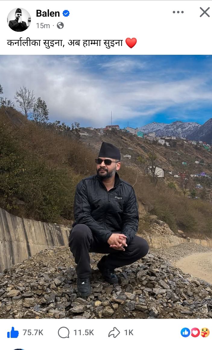 सुदूरपश्चिमको भ्रमण सकाएर कर्णाली प्रदेश भ्रमणमा निस्किएका उनले कालीकोटको मान्म पुगेर सामाजिक सञ्जालमा तस्बिर पोस्ट गर्दै लेखेका छन्, “कर्नालीका सुइना, अब हाम्मा सुइना ।”