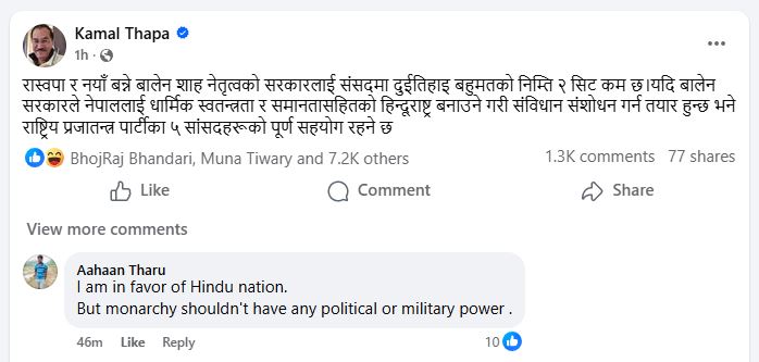 उनले भनेका छन्, ‘यदि प्रस्तावित सरकारले हिन्दूराष्ट्र पुन:स्थापना गर्ने विषयमा स्पष्ट प्रतिबद्धता जनाउँछ भने राप्रपा संसदमा संविधान संशोधनका लागि आवश्यक समर्थन दिन तयार रहनेछ ।’