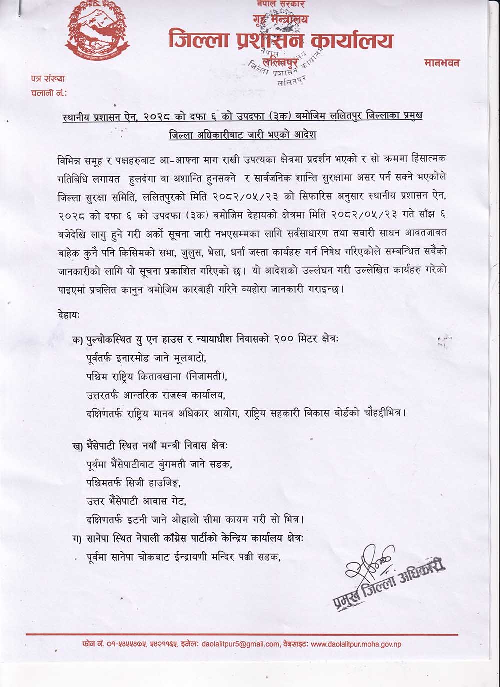 काठमाडौ । ललितपुर जिल्ला प्रशासन जिल्लाका विभिन्न भिआइपी क्षेत्रमा कर्फ्यु लगाएको छ ।