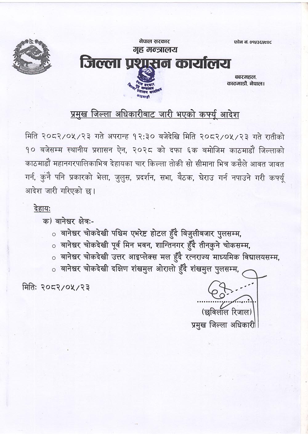 काठमाडौं । काठमाडौंको बानेश्वर क्षेत्रमा कर्फ्यु आदेश जारी भएको छ ।