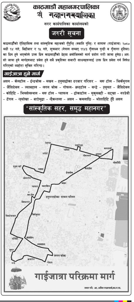 बिहीबार गाईजात्रा पर्व र शुक्रबार नेपाल संम्वत् ११४३ गुँलागा दुतिया पर्व मनाउने भएकाले काठमाडौं महानगरपालिकाले काठमाडौंका विभिन्न क्षेत्रमा सवारी आवगमन निषेध गर्ने भएको हो ।