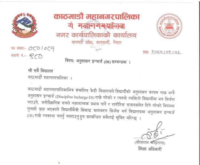 कठमाडौं । काठमाडौं महानगरपालिकाले विद्यालयहरुमा अनुशासन इन्चार्ज (डीआई) नराख्न सबै स्कुललाई निर्देशन दिएको छ ।