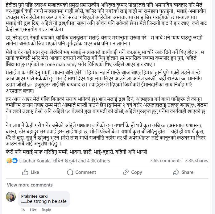 काठमाडौं । रामेछाप जिल्ला अस्पतालका मेडिकल सुपरिटेण्डेन्ट डा. केशव श्रेष्ठले फेसबुकमा लामो ‘अलिबिदा नोट’ लेखेर आफू देहत्याग गर्न लागेको जनाउ दिएका छन् ।