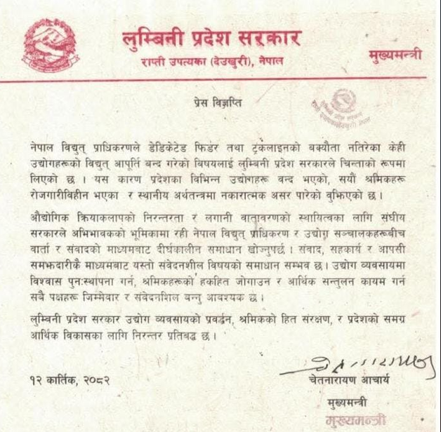 त्यसैगरी लुम्बिनीका मुख्यमन्त्री आचार्यले उद्योगहरूको विद्युत् आपूर्ति बन्दका कारण प्रदेशका विभिन्न उद्योगहरू बन्द भएको, सयौं श्रमिकहरू रोजगारीविहीन भएका र स्थानीय अर्थतन्त्रमा नकारात्मक असर पारेको बताएका छन् । औद्योगिक क्रियाकलापको निरन्तरता र लगानी वातावरणको स्थायित्वका लागि संघीय सरकारले अभिभावकको भूमिकामा रही नेपाल विद्युत् प्राधिकरण र उद्योग सञ्चालकहरूबीच वार्ता र संवादको माध्यमबाट दीर्घकालीन समाधान खोज्न उनले ध्यानाकर्षण गराएका छन् । ‘संवाद, सहकार्य र आपसी समझदारीकै माध्यमबाट यस्तो संवेदनशील विषयको समाधान सम्भव छ,’ उनले भनेका छन्, ‘उद्योग व्यवसायमा विश्वास पुन:स्थापना गर्न, श्रमिकहरूको हकहित जोगाउन र आर्थिक सन्तुलन कायम गर्न सबै पक्षहरू जिम्मेवार र संवेदनशिल बन्नु आवश्यक छ ।’