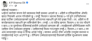 ओलीले फेसबुकमा लेखेका छन्, ‘ भाइरल ज्वरोका कारण मेरो स्वास्थ्यमा केही समस्या आएको छ । अहिले म एन्टिबायोटिक औषधि खाएर निवासमै आराम गरिरहेको छु ।’