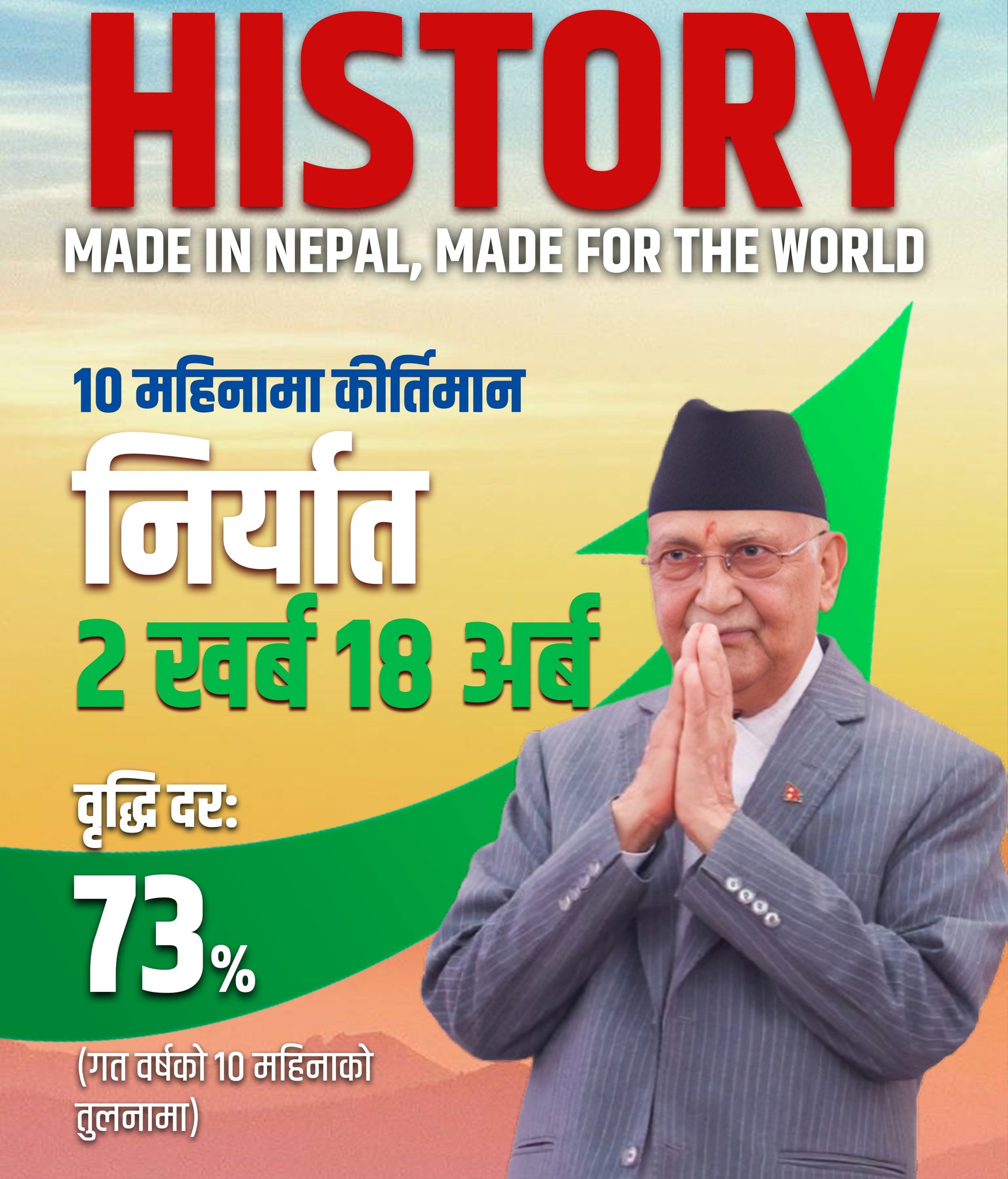 “बितेका १० महिनामा गत वर्षको तुलनामा निर्यात ७३ प्रतिशतले वृद्धि भएको छ । यस अवधिमा दुई खर्ब १८ अर्बको निर्यात भएको छ । अर्थतन्त्र सकारात्मक बाटोमा लैजाँदै छौँ”, प्रधानमन्त्री ओलीले उल्लेख गरे ।