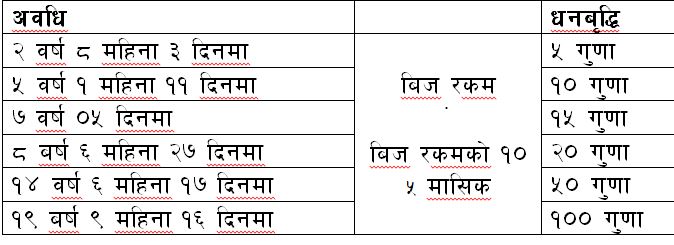 योजनामा आफ्नो चाहना तथा भविष्यको आवश्यकता अनुसार न्युतम दस हजार देखि दस लाख सम्म प्रारम्भिक बिज रकम जम्मा गरि निम्न अनुसारको धनबृद्धि लक्ष्य प्राप्त गर्न सकिन्छ ।