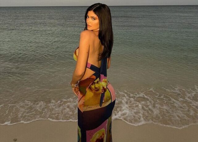 काइली जेनर समुद्र तटमा उभिएर पो,ज दिईरहेकी छिन्। उनले प्रिटेन्ड म्याक्सी ड्रेस लगाएकी छिन् ।