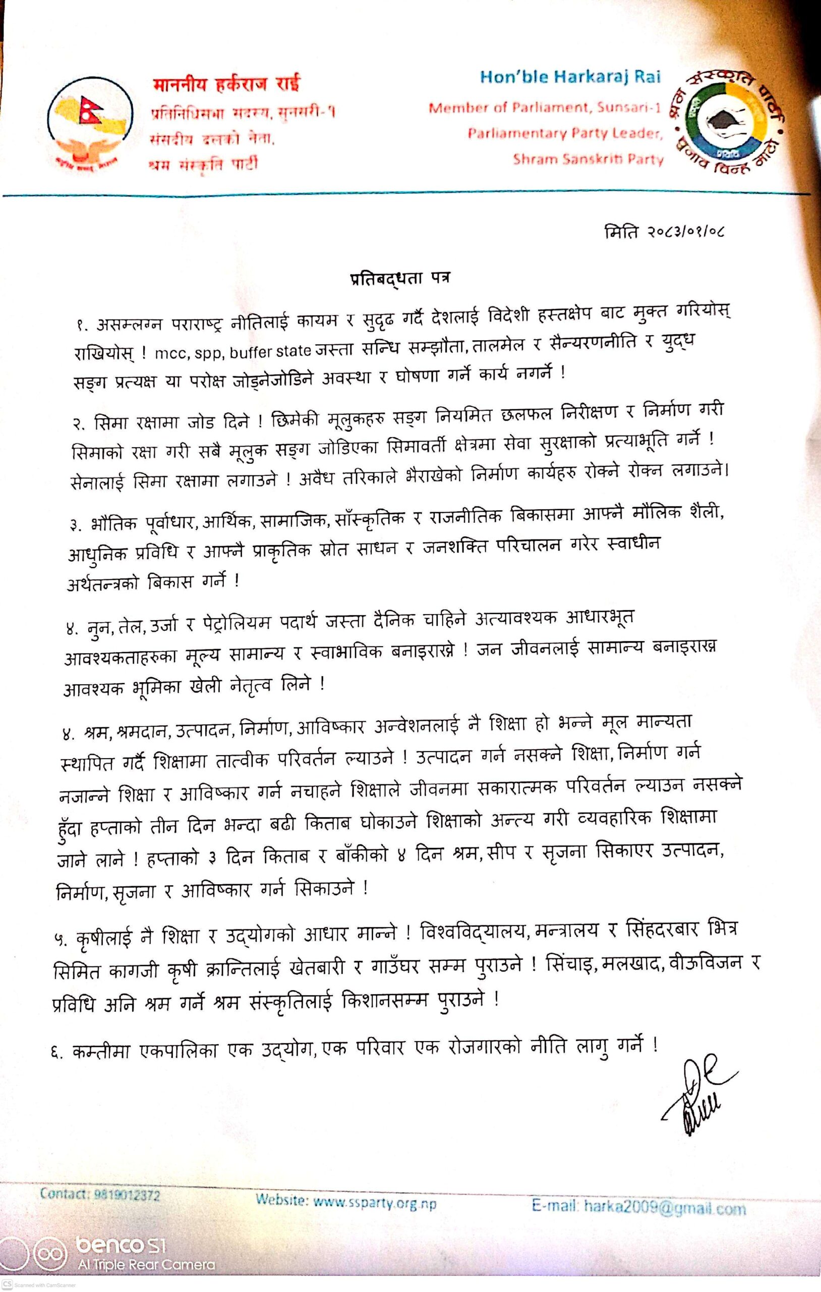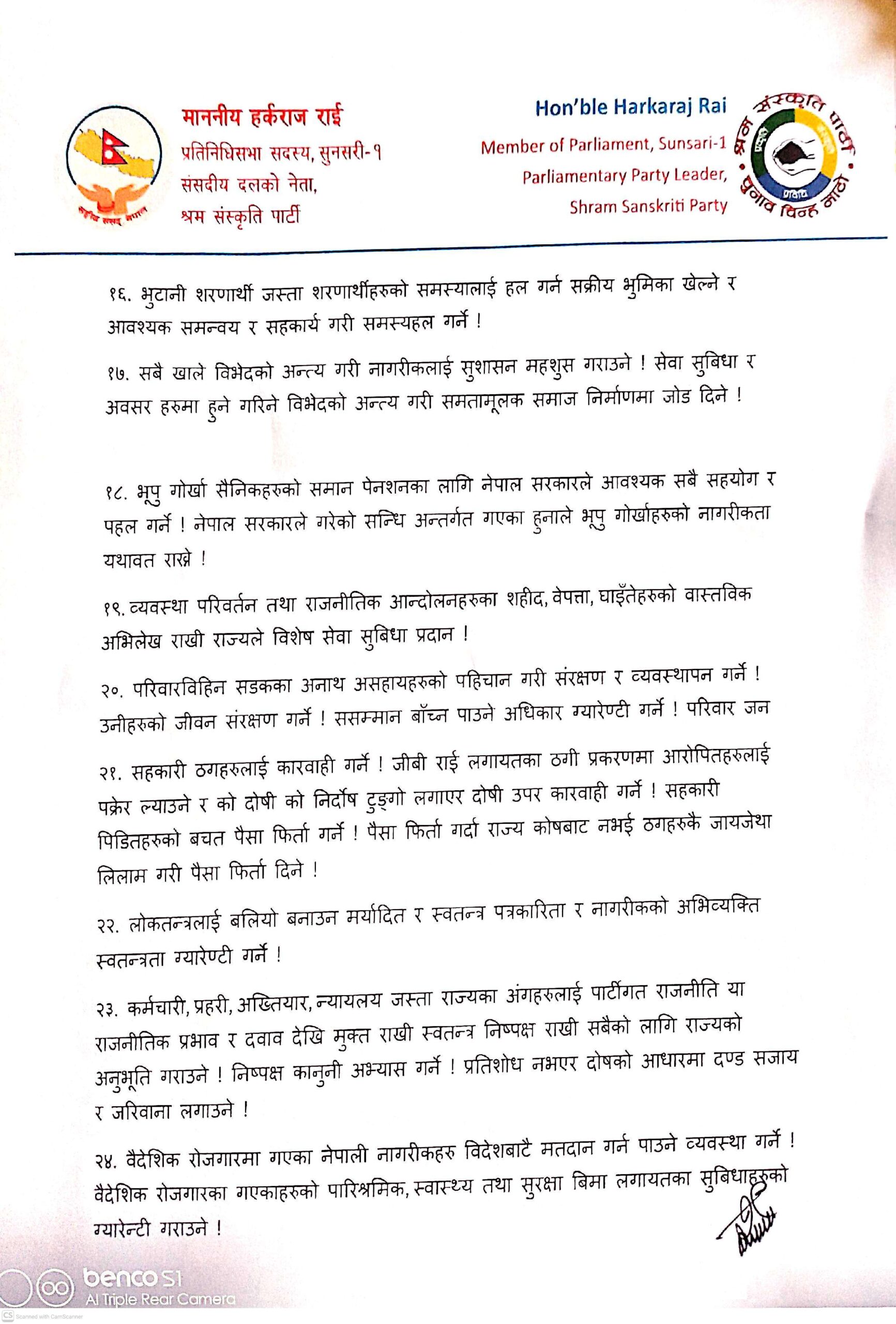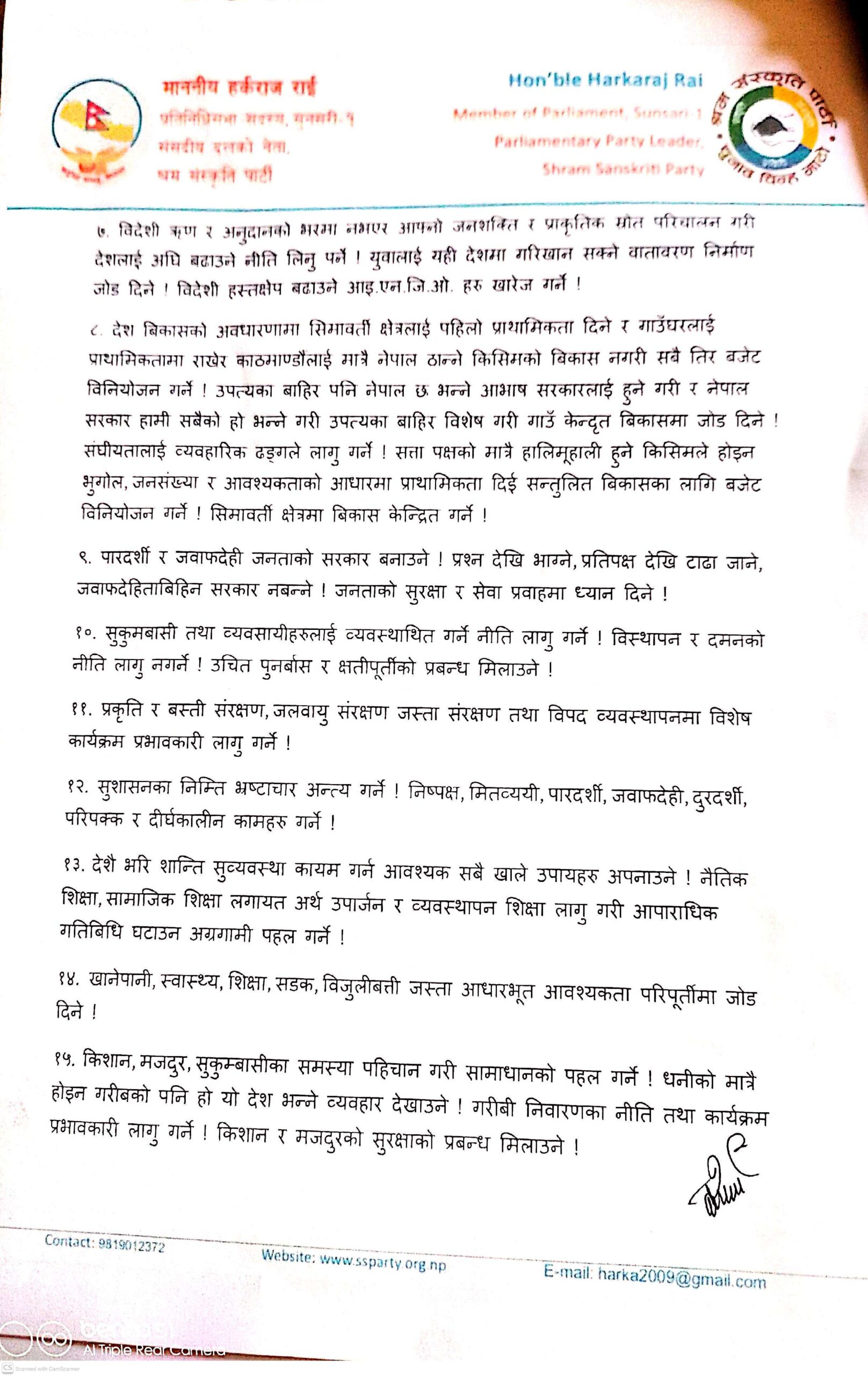 नुन, तेल, पेट्रोलियम जस्ता आधारभूत वस्तुको मूल्य सामान्य राख्ने, हप्ताको ३ दिन किताबी ज्ञान र ४ दिन श्रम, सीप तथा उत्पादनमूलक व्यावहारिक शिक्षा दिने नीति बनाउनुपर्ने, कृषिलाई शिक्षा र उद्योगको आधार मान्ने, सिँचाइ, मल र बिउ किसानको पहुँचमा पुर्याउनुपर्ने, एक परिवार, एक रोजगार’को नीति लागू गर्नुपर्नेलगायतको सुझाव दिएका छन्।