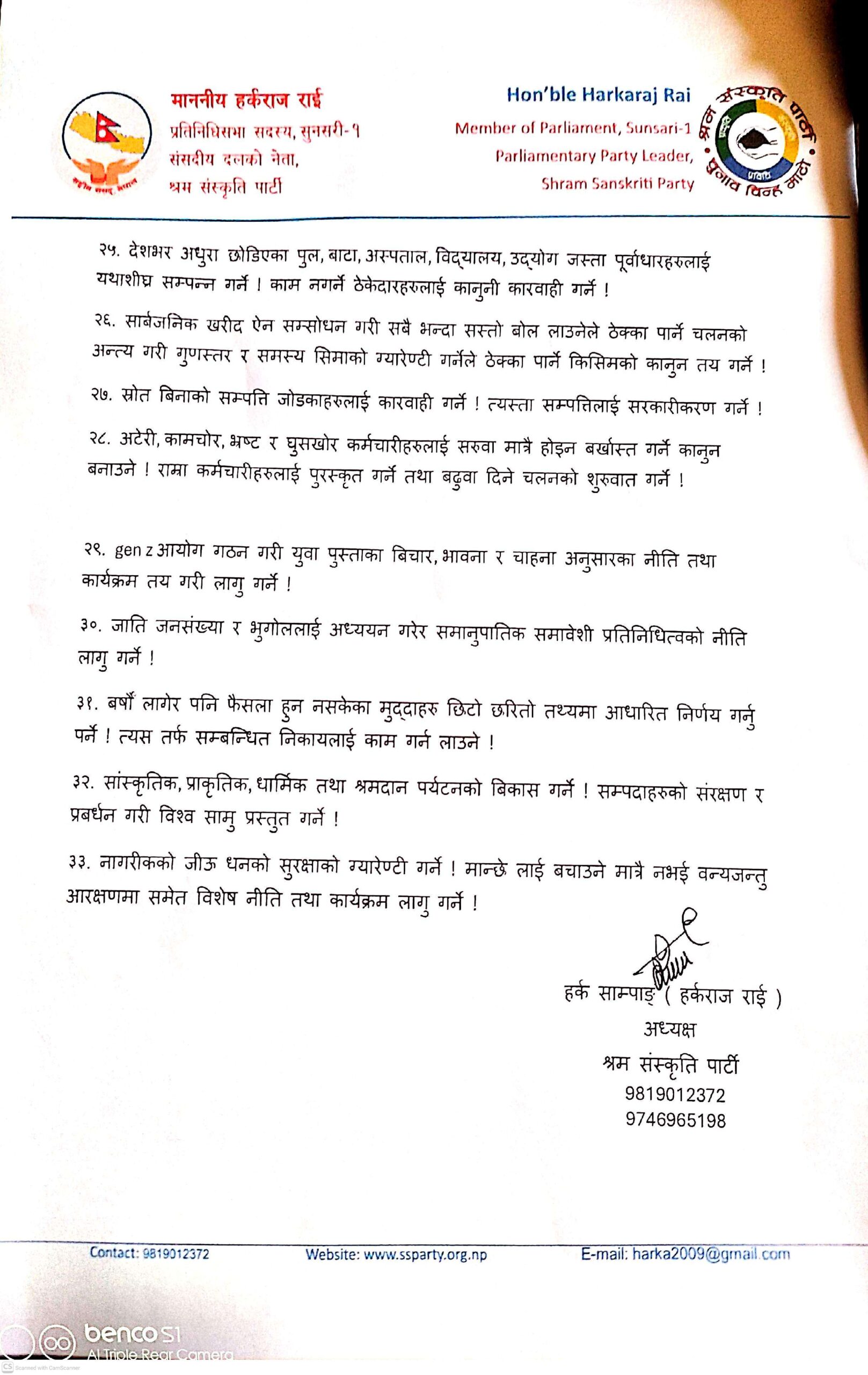 काठमाडौं । श्रम संस्कृति पार्टीका अध्यक्ष हर्क साम्पाङले सरकारलाई ३३ बुँदे सुझाव दिएका छन्। आज काठमाडौंमा पत्रकार सम्मेलन गरेर साम्पाङले सुझाव सार्वजनिक गरेका हुन् ।