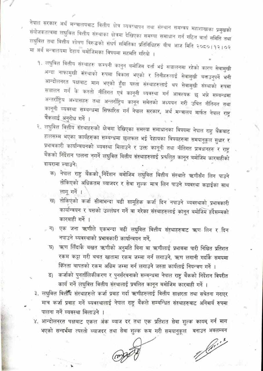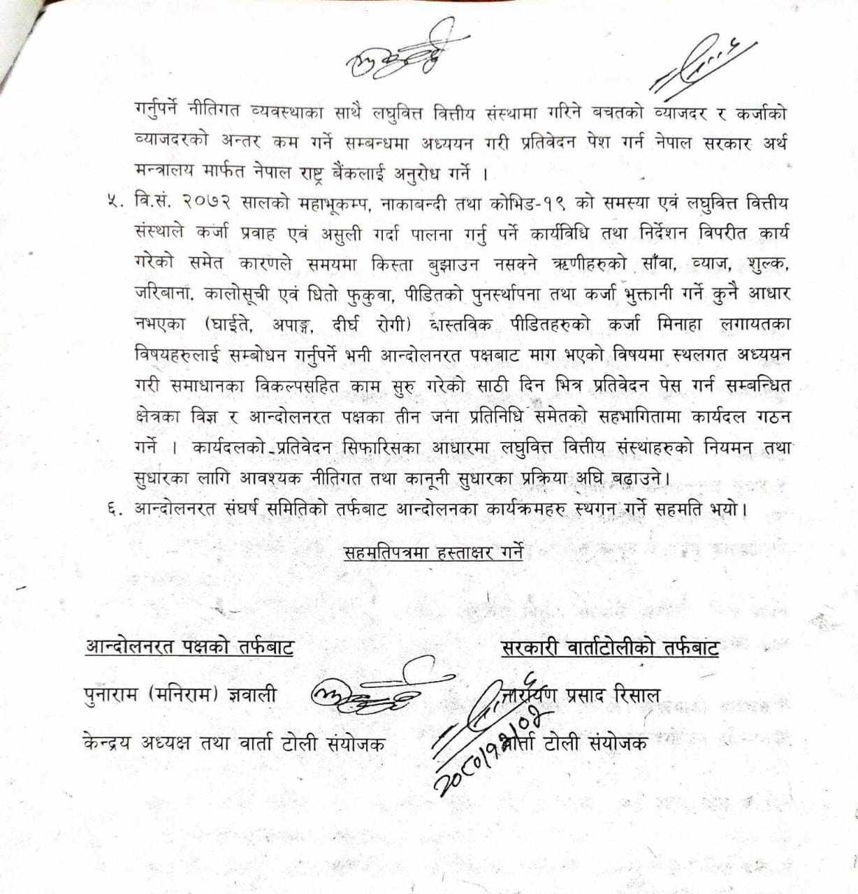 सहमति पत्रमा सरकारको तर्फबाट वार्ता टोलीका संयोजक सह–सहसचिव एवम् वित्तीय क्षेत्र व्यवस्थापन तथा संस्थान महाशाखा प्रमुख नारायणप्रसाद रिसाल र आन्दोलनकारीका तर्फबाट वार्ता टोली संयोजक पुनाराम (मनिराम) ज्ञवालीले हस्ताक्षर गरेका छन् ।