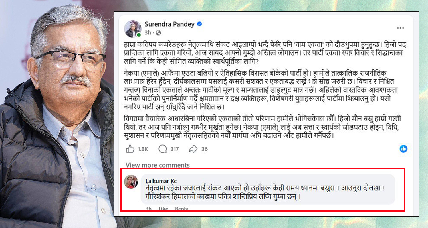 ‘नेतृत्वमा रहेका जो–जसलाई सङ्कट आएको हो उहाँहरू केही समय ध्यानमा बस्नुस् । आउनुहोस् दोलखा ! गौरीशंकर हिमालको काखमा पवित्र शान्तिप्रिय लप्ची गुम्बा छन्,’ उनले पार्टी नेता सुरेन्द्र पाण्डेलाई ‘मेन्सन’ गर्दै फेसबुकमा लेखेका छन् ।