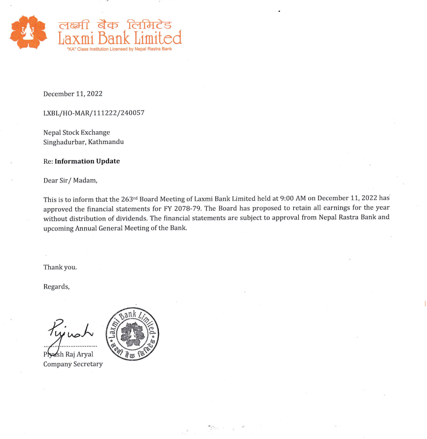 बैंकको आइतबार बसेको सञ्चालक समितिको बैठकले आर्थिक वर्ष २०७८/०७९ को नाफाबाट लाभांश नदिने निर्णय गरेको छ ।