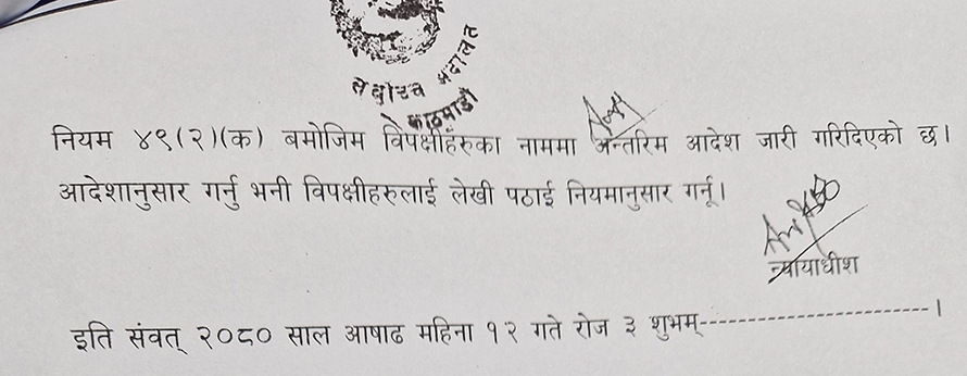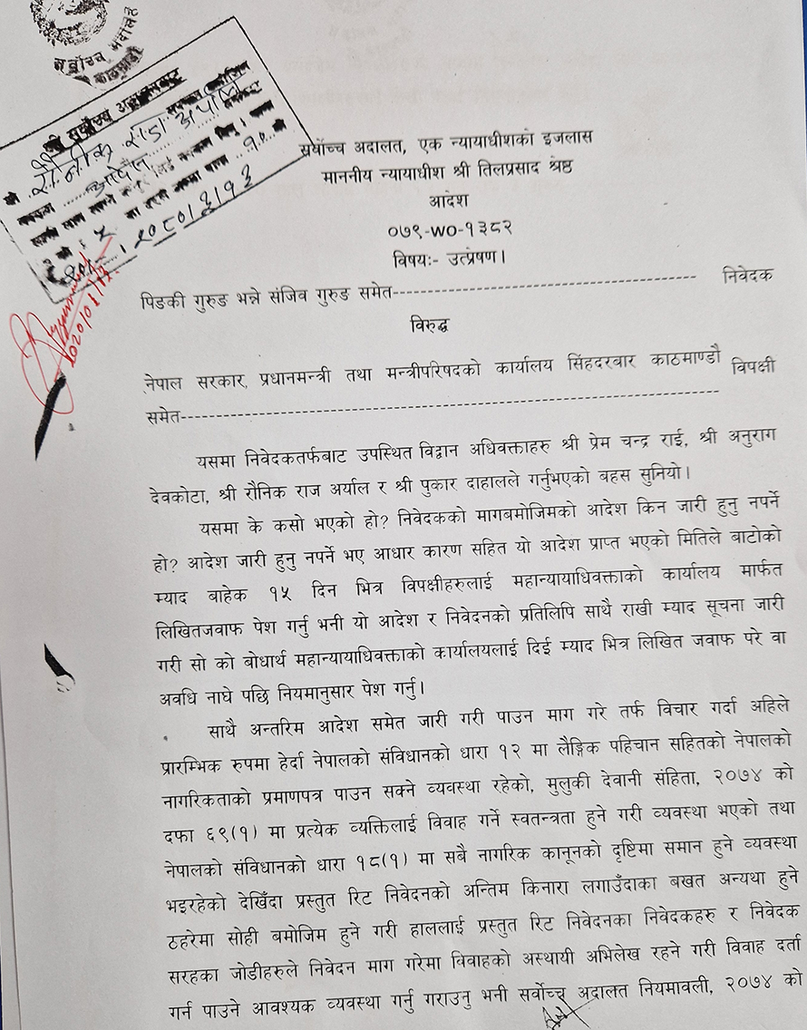 मंगलबार न्यायाधीश तिलप्रसाद श्रेष्ठको एकल इजलासले समलिंगी विवाह गर्ने जोडीहरुले निवेदन माग गरेमा विवाहको अस्थायी अभिलेख रहने गरी विवाह दर्ता गरिदिन आवश्यक व्यवस्था गरिदिन अन्तरिम आदेश जारी गरेको हो ।