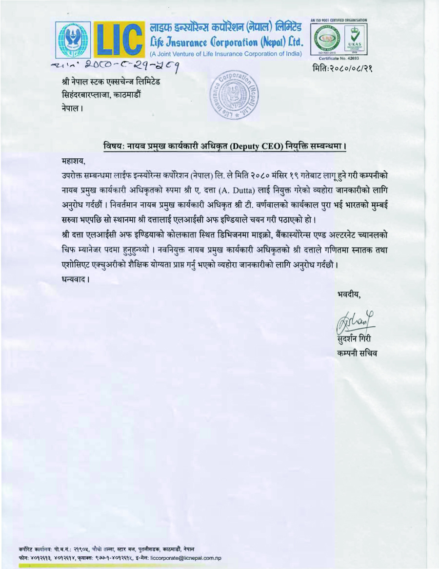 डीसीईओ नियुक्त भएका दत्ता एलआईसी अफ इन्डियाको कोलकोतास्थित डिभिजन माईक्रो, बैंकास्योरेन्स एण्ड अल्टरनेट च्यानलको चिफ म्यानेजर थिए ।