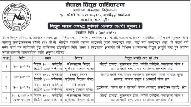 नेपाल विद्युत् प्राधिकरण आयोजना व्यवस्थापन निर्देशनालय अन्तर्गत सञ्चालित १३२ केभी प्रसारण कन्डक्टर अपग्रेडिङ आयोजनाले स्युचाटारदेखि बालाजु सबस्टेसनसम्म रहेको १३२ केभी भोल्टेज स्तरको प्रसारण लाइनको तार परिवर्तन गर्ने भएका कारण आपूर्ति बन्द हुने भएको हो ।