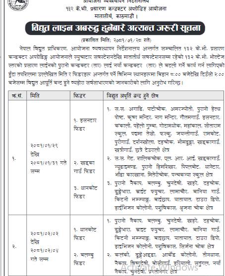 काठमाडौं । काठमाडौं उपत्यकाको विभिन्न स्थानमा विद्युत् अवरुद्ध हुने भएको छ ।