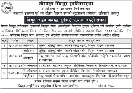 प्राधिकरणका अनुसार जेठ ३ गते नयाँबजार, जेठ ५ गते नयाँबजार र क्षेत्रपाटी, जेठ ६ गते भिमसेनस्थान र जेठ ८ गते भिमसेनस्थान र त्रिपुरेश्वर क्षेत्रमा विद्युत् सेवा अवरुद्ध हुन लागेको हो ।