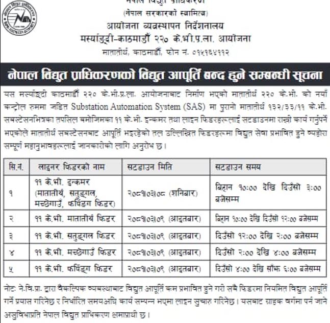 मर्स्याङ्दी काठमाडौँ २२० केभी आयोजनाबाट निर्माण भएको मातातीर्थ २२० केभीको नयाँ कन्ट्रोल रुममा जडित शवस्टेशन अटोमेशन सिस्टमलाई सटडाउनमा राखी कार्य गर्नुपर्ने भएकोले मातातीर्थ सबस्टेसनबाट आपूर्ति भइरहेको स्थानमा विद्युत् आवागमन प्रभावित हुने भएको छ ।