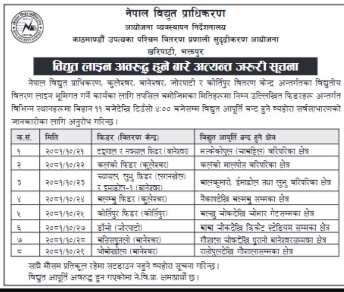 नेपाल विद्युत् प्राधिकरणका अनुसार आज बानेश्वर, जोरपाटी, कुलेश्वर र कीर्तिपुर वितरण केन्द्र अन्तरगतका विद्युतीय वितरण लाइन भूमिगत गर्ने भएकाले आगामी ८ दिनसम्म बिहान ११ देखि दिउँसो ४ बजेसम्म विद्युत् आपूर्ति बन्द हुने भएको छ ।